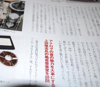 また上田氏はソウル系ソフトもお好きなようで前号で僕がTC-9400の試聴に使ったアレサフランクリンやロバータフラックも興味があるということで話は盛り上がった。亀吉音楽堂もプロツールスが主体だが、最近はアナログ音源の良さを再認識しているという。その端緒は、マイケルジャクソンの「オフザウォール」の海外プレスCDをリッピンぐして、その音と古いアナログディスクを聴き比べた時だという。PCモニター画像でも明らかなように、過度なダイナミックレンジの圧縮が行われ、常に大きな音量が記録されて圧迫感があり、正直、長時間聴く気になれない音だ。それに対して、アナログディスクは、伸び伸びとして、リズムの乗り良く、グル―ヴ感がある。そんなところから、アナログ時代の音源やアナログテープの音の良さを再認識し、機会があればアナログマスターを使ってゆきたいという。また仕事上、クライアントの要求に従って、過度なDレンジの圧縮をしなくてはならない点など、現代のソフト制作現場はいろいろと考えなおさなくてはならない時期に来ているのでは、と語ってくれた。僕のCD制作手法と使用機器などに違いはあるが、今後もお互いに本当に良い音を追求したいものだ。また、ぜひともアナログマスターを使用した作品をリリースしてほしいとも思う。