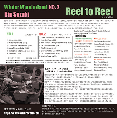 亀吉レコードでは、2013年6月に同レーベルのアーティストのオムニバス的なオープンテープを発表したが、3作目の今回は2巻まとめて発売となった。 本作は、今年(2021年)11月にリリースされた人気ヴォーカリスト鈴木輪のクリスマスソング集。 デジタルマルチ音源から、デジタルとアナログ機器を併用してミックスダウンを行ったオープンリールテープ用の96kHz・32bitマスターを使い、スチューダーA807で1対1にてダビングし製品化されている。